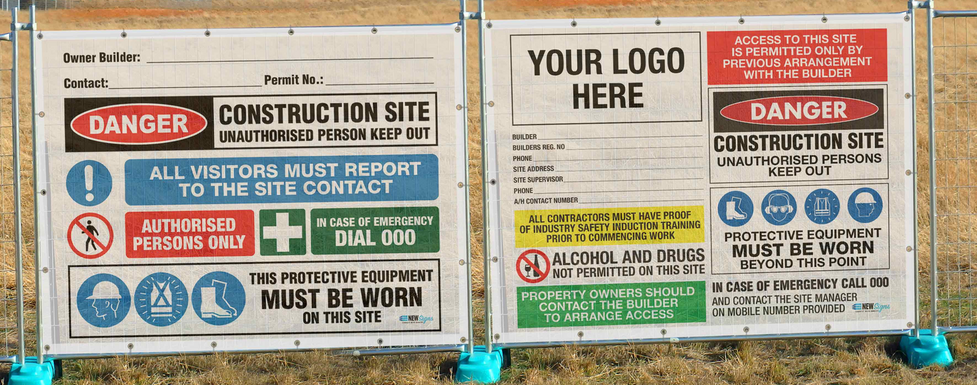 - Mesh Banners – ideal for fencing, these large-format banners combine branding with vital safety messages, helping to secure your site while keeping it professional. Customise your own banner or choose from pre-designed Site Entry Sign Mesh Banners.