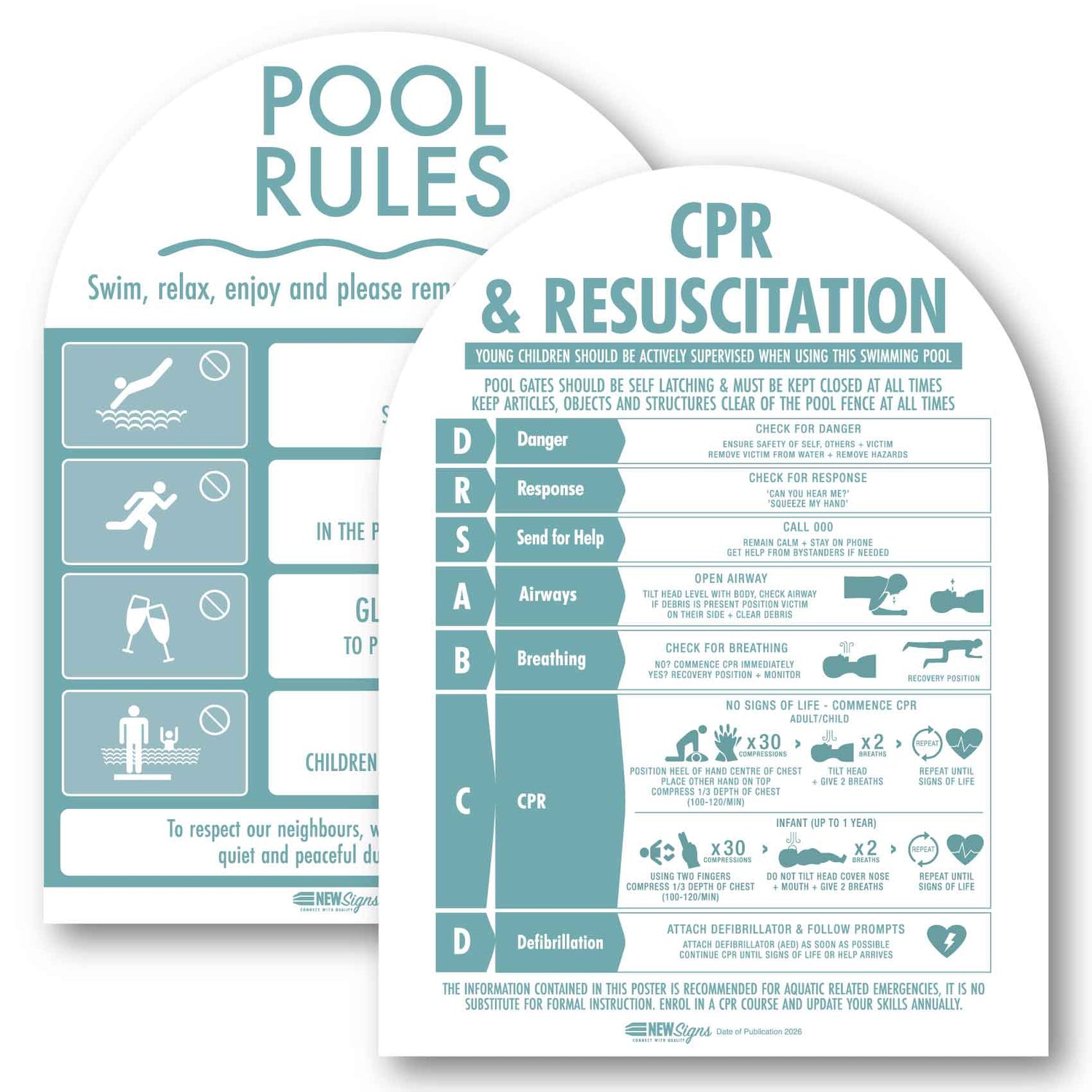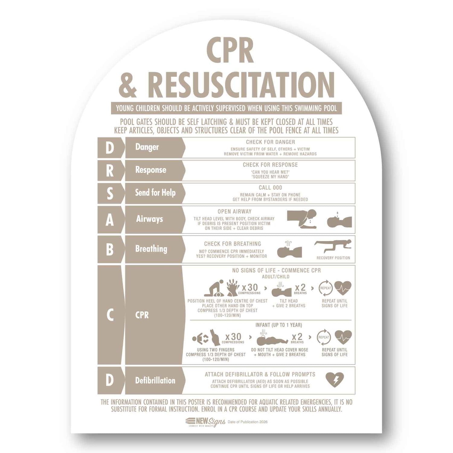 Our Premium CPR Signs feature modern arch shapes, contemporary colour palettes and bold graphics for easy readability. Designed for both style and functionality, these signs are made from durable, weather-resistant materials ideal for Australian conditions. Each sign includes clear resuscitation instructions that follow current CPR guidelines - ensuring anyone near your pool has access to vital information in an emergency.