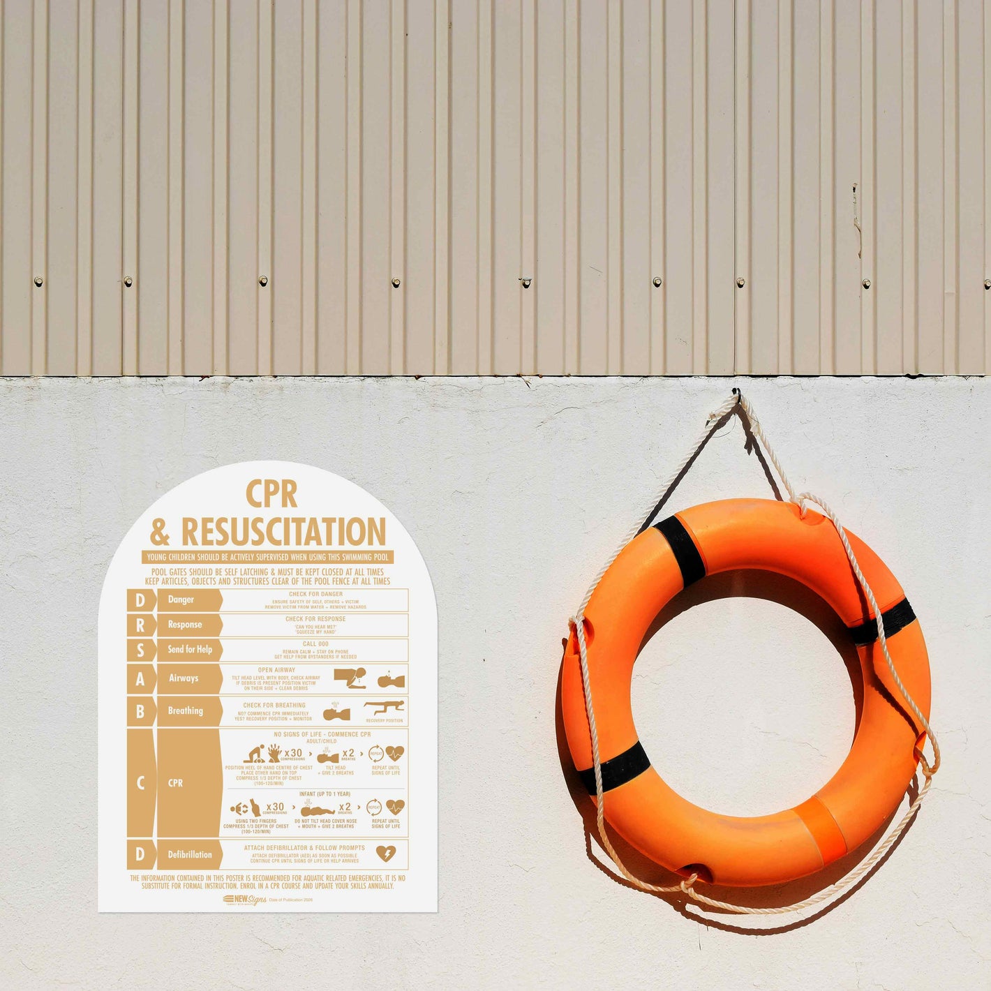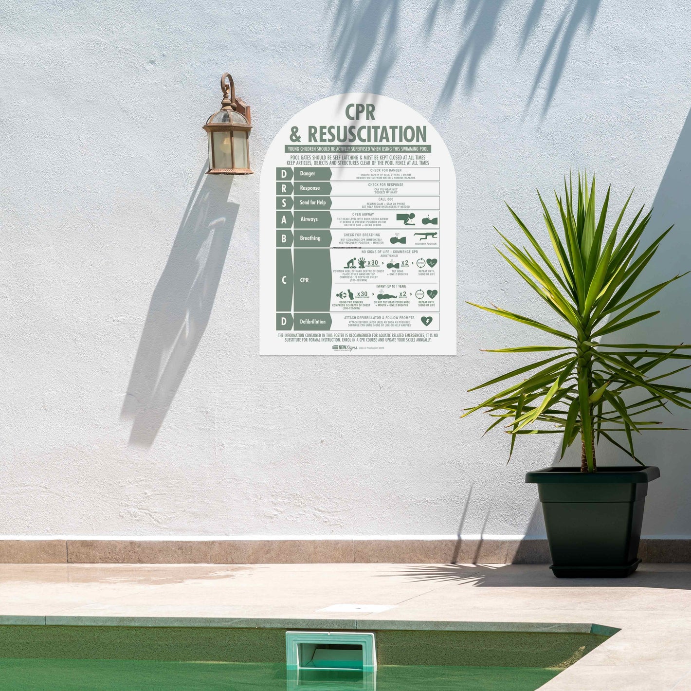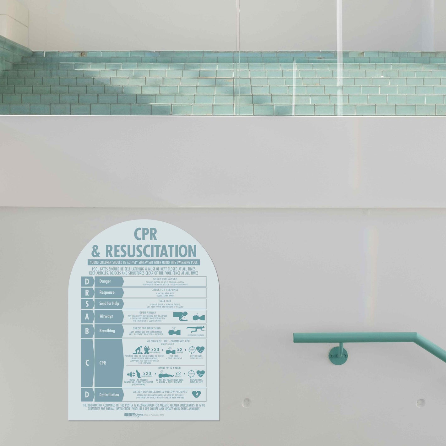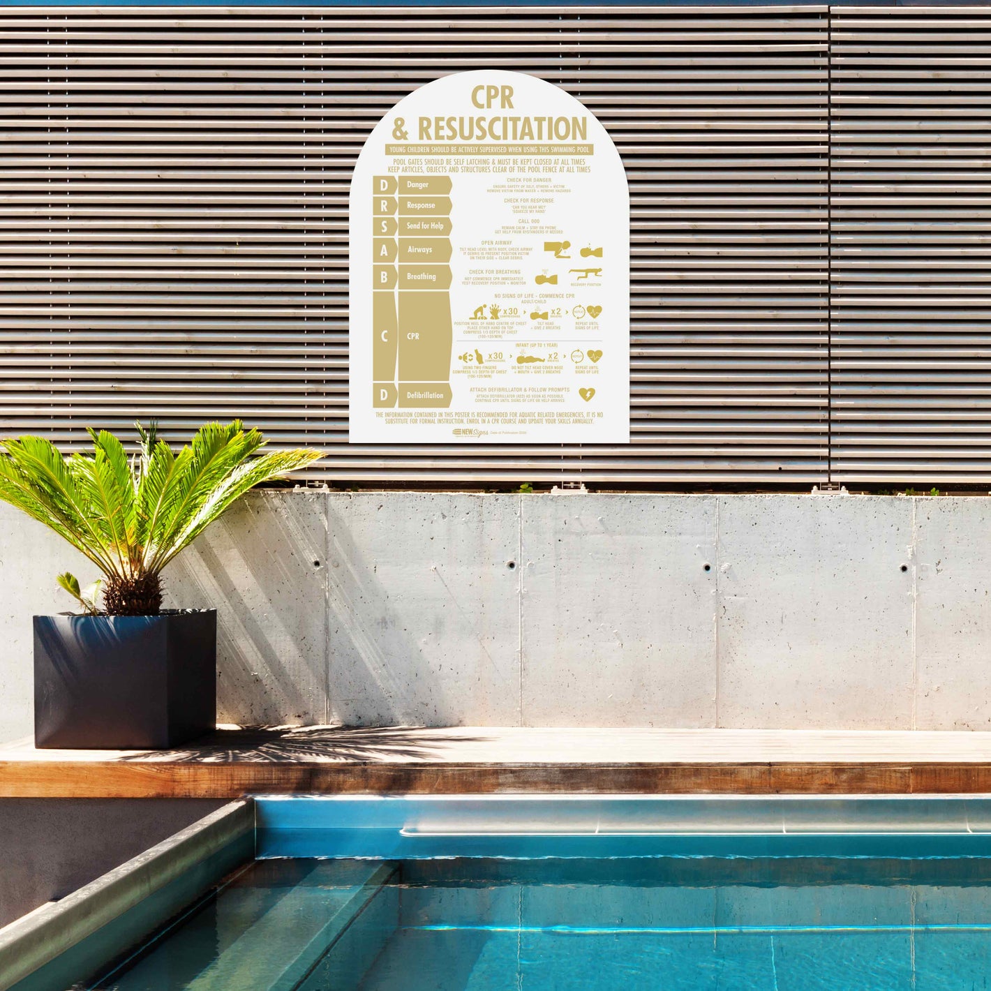 Our Premium CPR Signs combine compliance with visual appeal. Designed with an elegant arch shape and modern colour palettes, they ensure life-saving instructions are highly visible while enhancing the aesthetic of any pool environment.