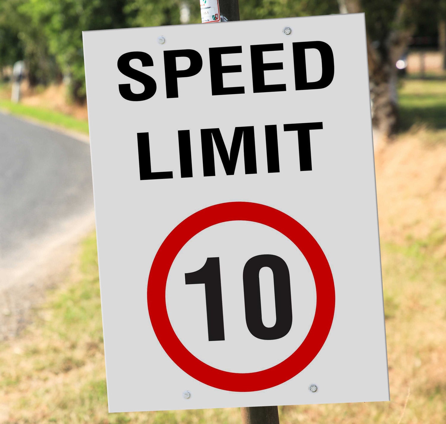 Most shared driveways and private access lanes use 5–15 km/h speed limits, depending on visibility and foot traffic. Popular options include “Shared Driveway 10”, “Children at Play 10”, or “Shared Zone 10” to reinforce the need for caution.