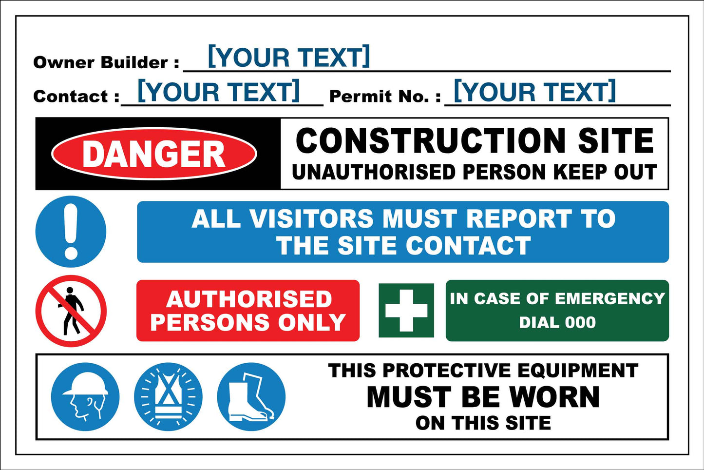 This sign includes limited customisations. If you require a fully custom site entry sign specific for your site or require alterations to an existing sign on our site you can order it online though our Custom Signs page or email your requirements to admin@newsignsgroup.com.au for a quote.
