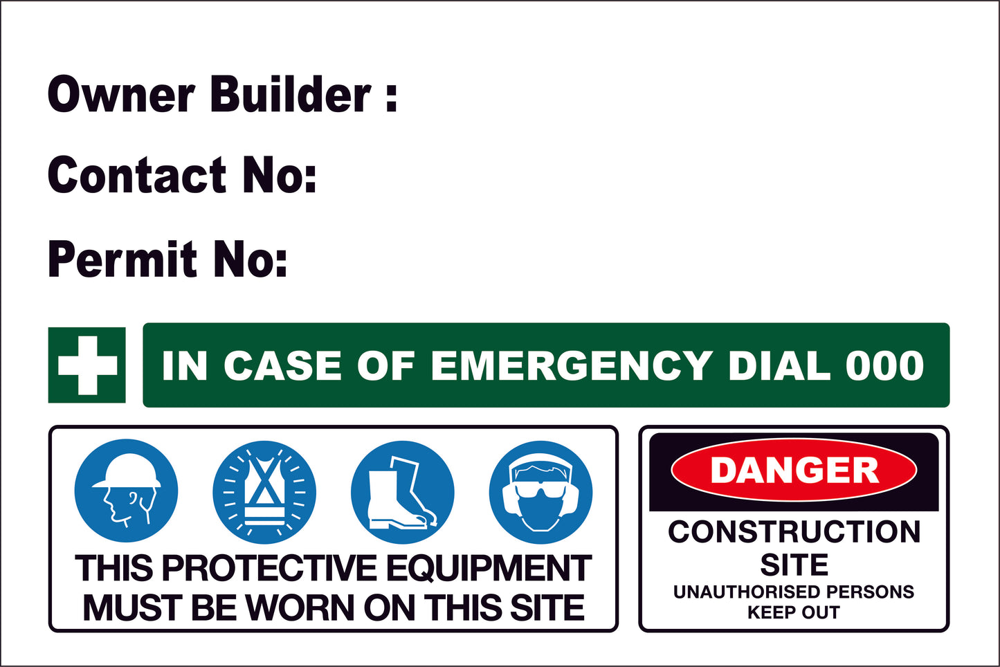 This sign includes limited customisations. If you require a fully custom site entry sign specific for your site or require alterations to an existing sign on our site you can order it online though our Custom Signs page or email your requirements to admin@newsignsgroup.com.au for a quote.