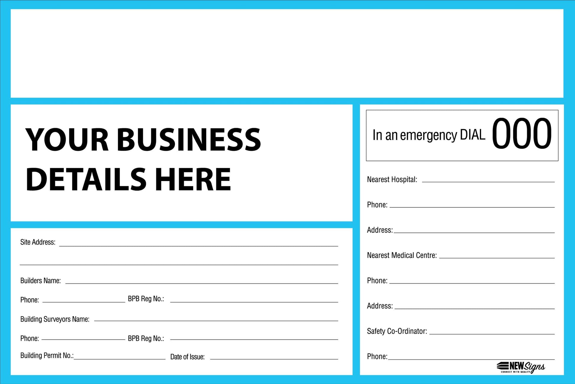 If the sign includes additional fields like Builder / Site Address / Site Supervisor etc and you would like these details printed onto the sign, you can add these details at Step 4: Enter Text. Our designers will add the details for you.