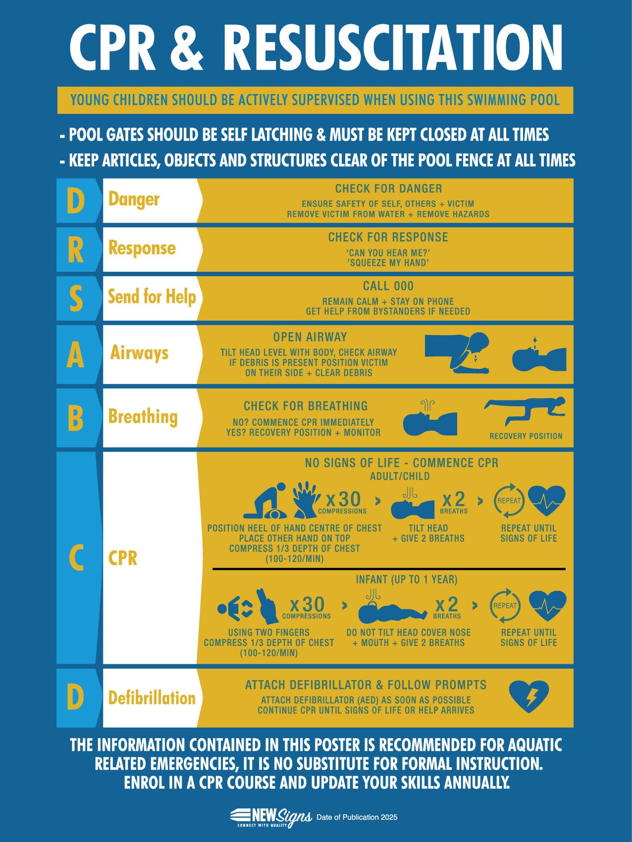 This CPR resuscitation sign is now a legal requirement in QLD for all pools and spas and for all new pools and spas in all other states and territories.