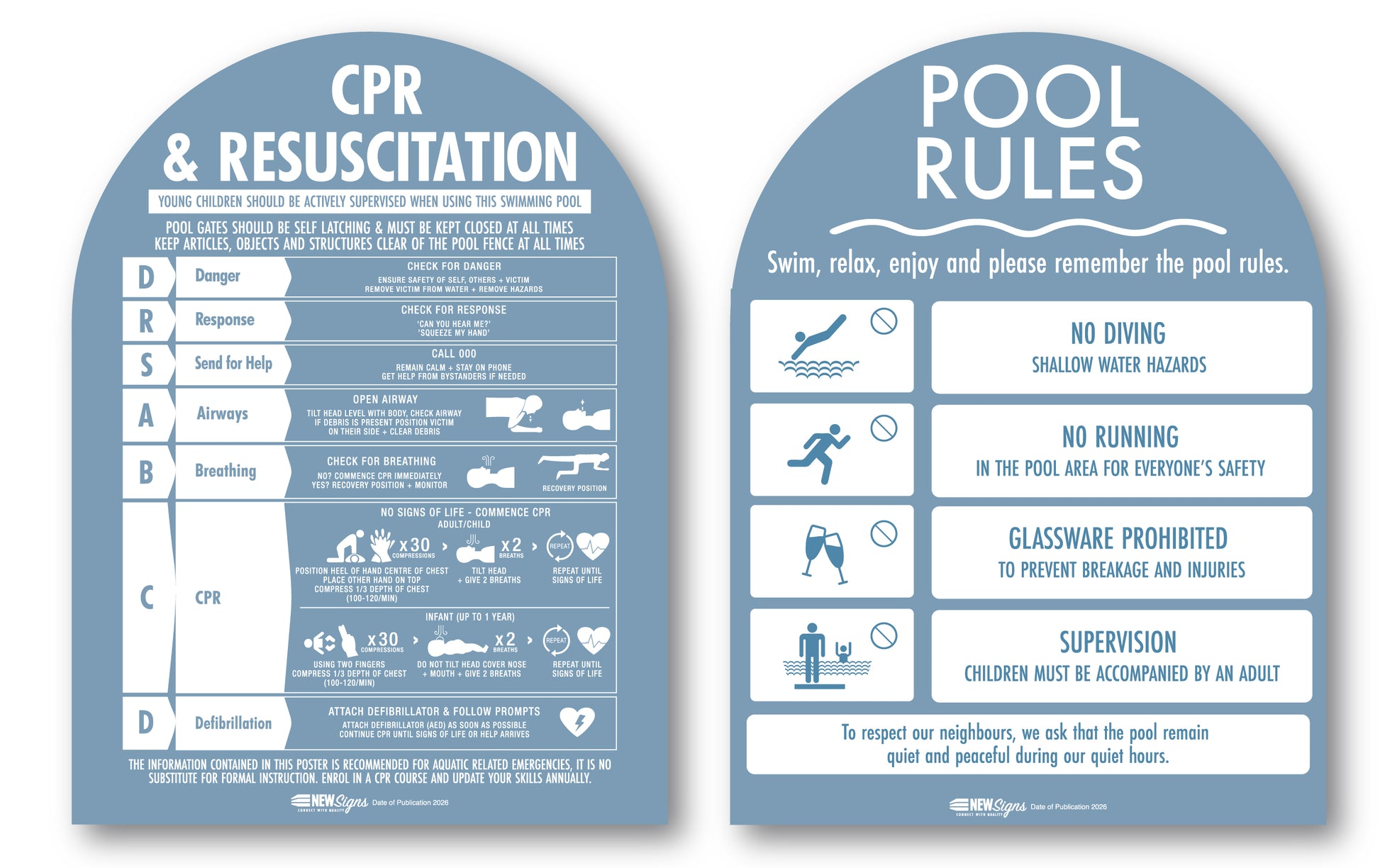 Engineered for Australian conditions, each sign is crafted from durable, weatherproof materials with digitally printed, UV-resistant graphics to ensure lasting clarity. Our CPR Signs are fully compliant with ANZCOR Guideline 8, giving you complete confidence that your pool area is both safe and up to code.