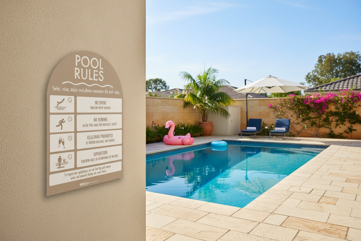 Enhance your pool space with our modern arch-shaped Pool Rules Signs, designed to bring together safety and style. Part of our Premium Range, these signs feature an elegant curved design and contemporary colour palettes, making them the perfect addition to any pool area.